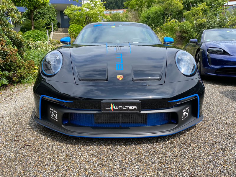 Mit der Bestellung des neuen 992 GT3 entstand beinahe gleichzeitig das neue Projekt b.l.u.NERO. Es sollte wieder ein uniquer GT3 entstehen. Schwarz uni kombinert mit der Promotionsfarbe „Sharkblue“ des 992 GT3 – das war ganz bald die Idee und natürlicherweise der Namensgeber. Walter platzierte die Namensgebung ins Italienische, weil es diesmal mehr die Grandezza der italienischen Designer im Sinne von auffallender Eleganz werden sollte. BLU – blau NERO – schwarz. Das war die Initialzündung.